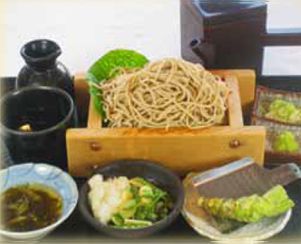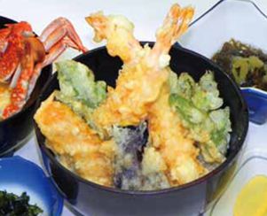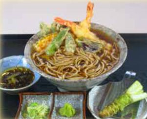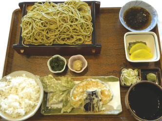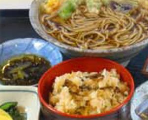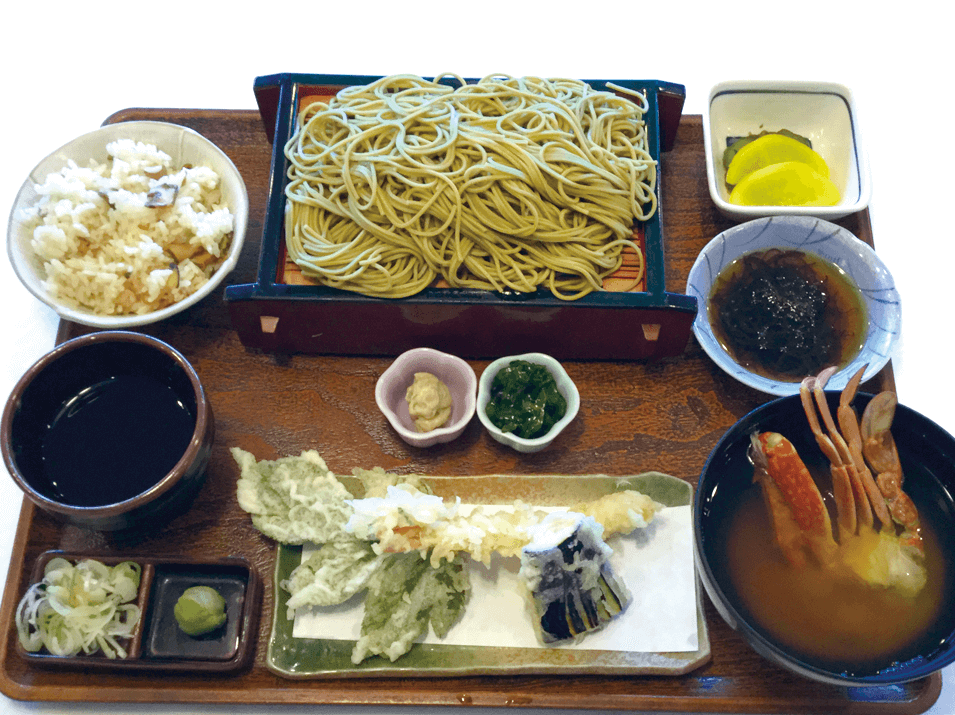 茶そば 天ぷら サザエ飯 小鉢 香の物 カニの味噌汁