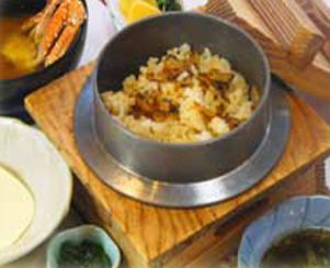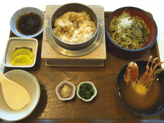 サザエ飯 茶そば カニの味噌汁 小鉢 小付け 香の物