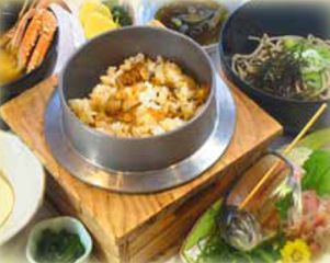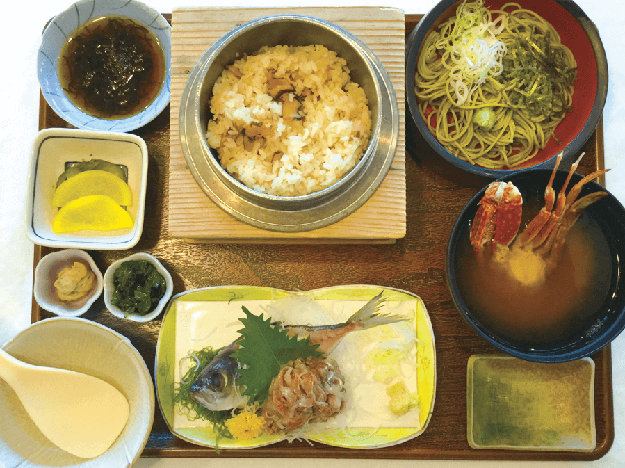 サザエ飯 アジのたたき 茶そば カニの味噌汁 小鉢 小付け 香の物