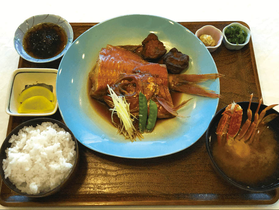 金目鯛の煮付け ご飯 カニの味噌汁 小鉢 小付け 香の物