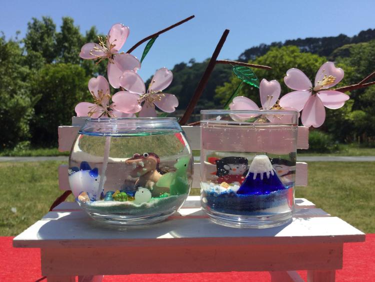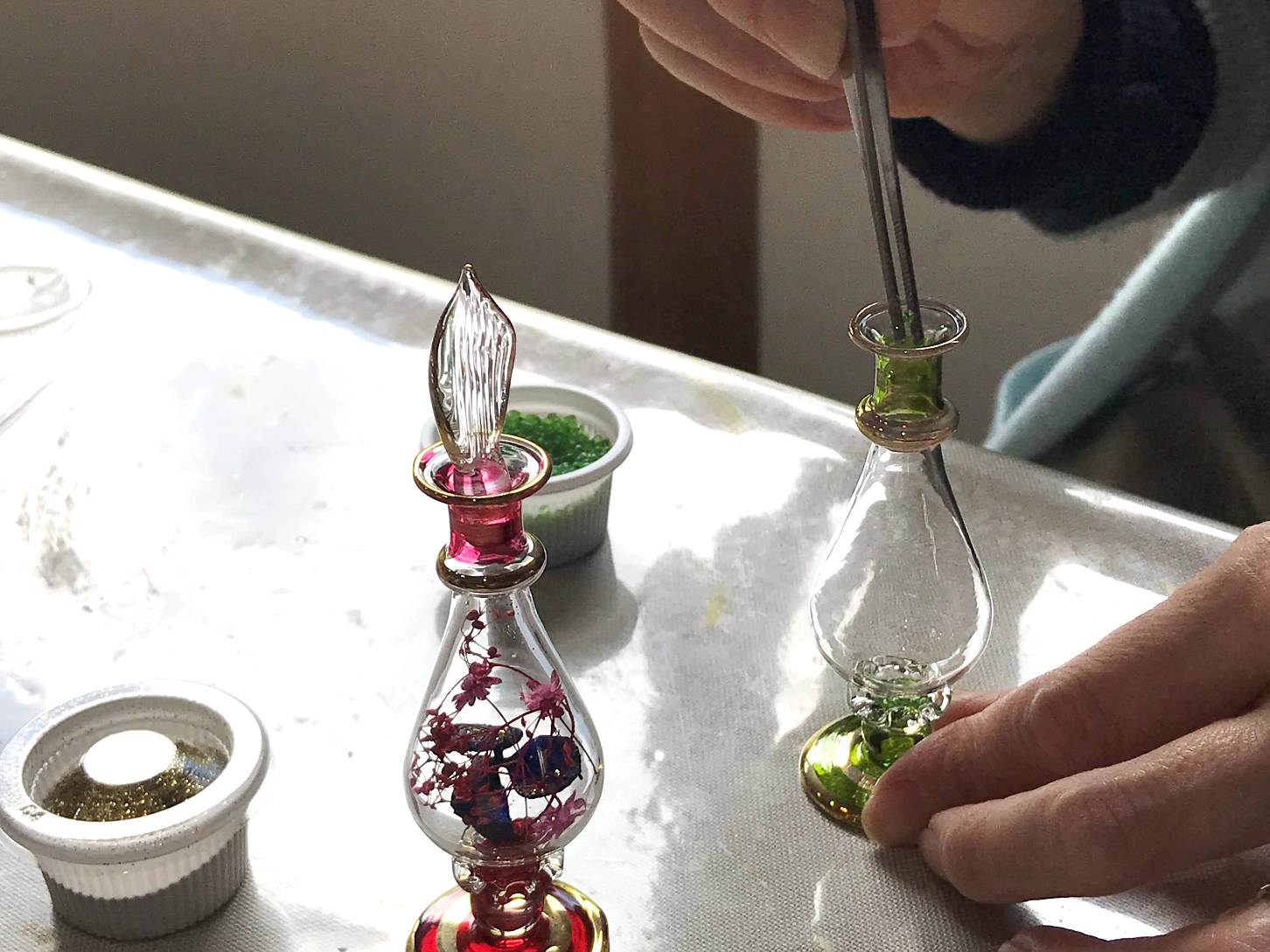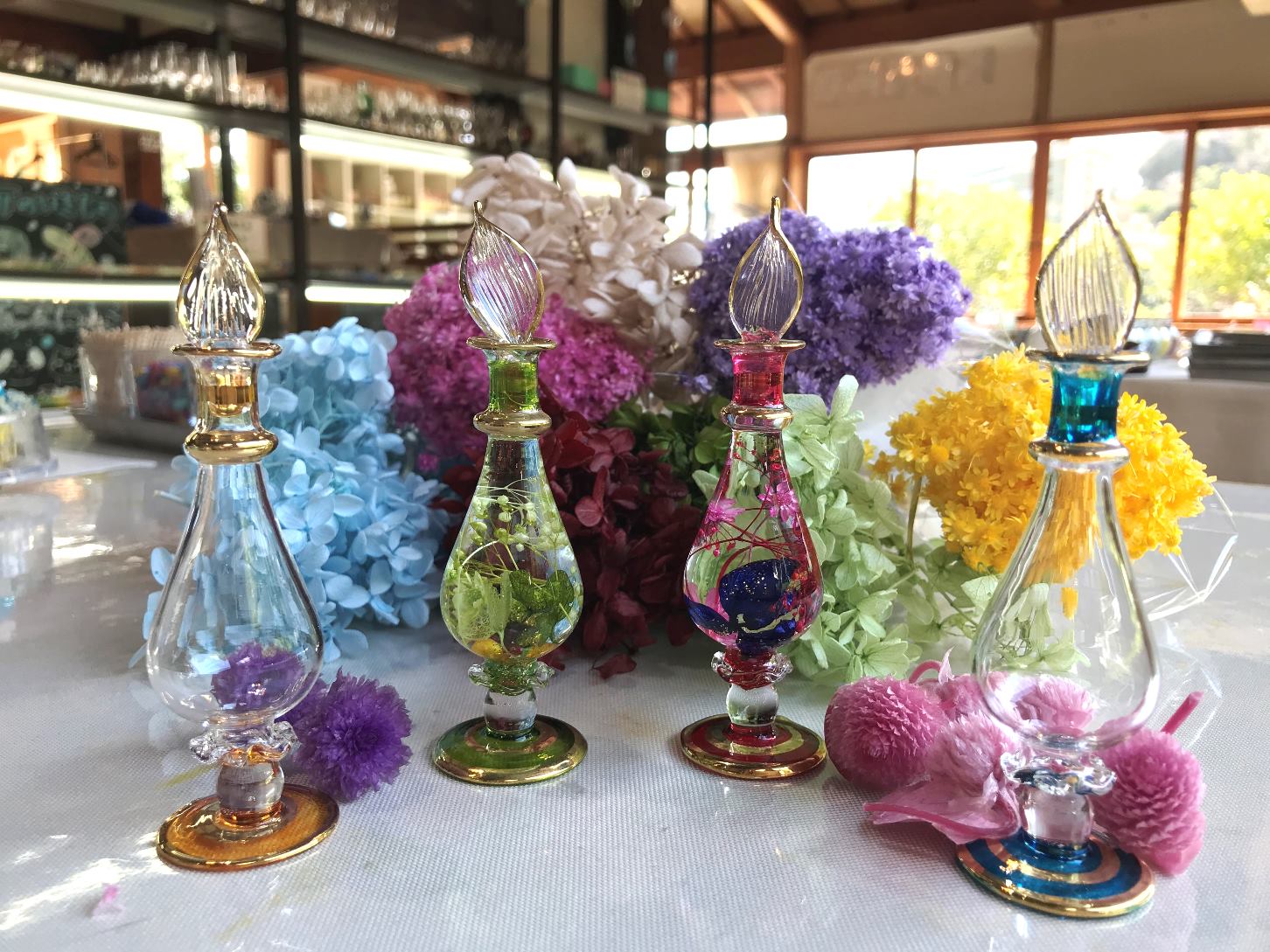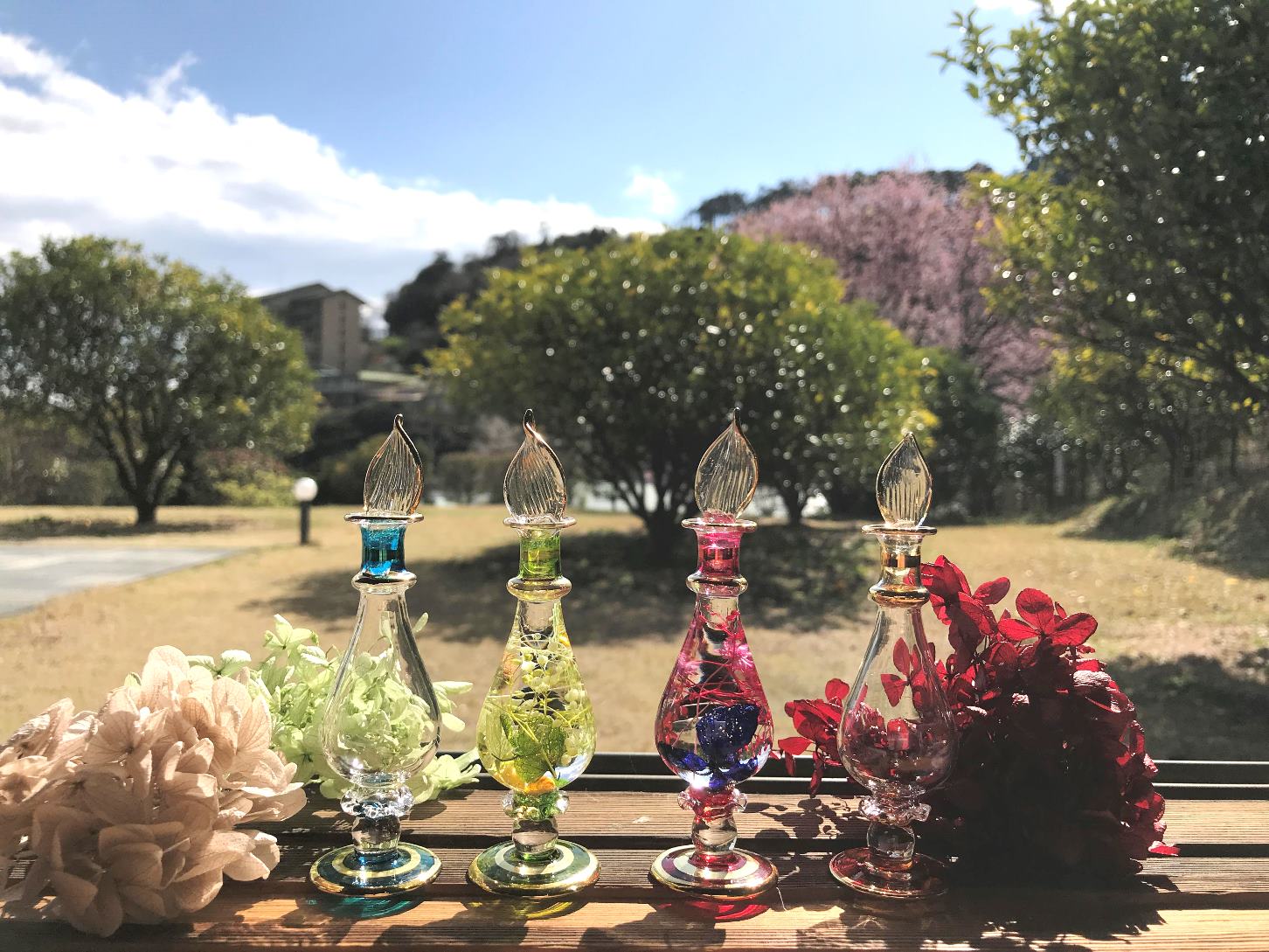 カラフルなガラス粒、プリザーブドフラワーを入れることができます。 最後に、オイルを追加し、ガラスストッパーで取り付けます。 (オイル漏れ防止対策)完成後はお持ち帰りいただけますので、伊豆旅行のお土産としてオススメです。