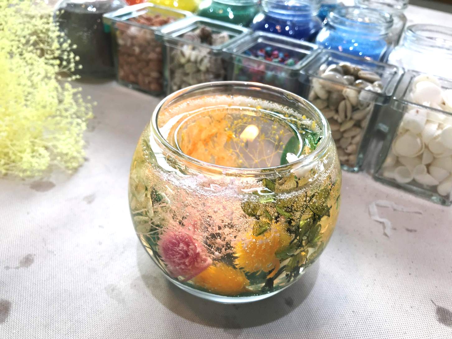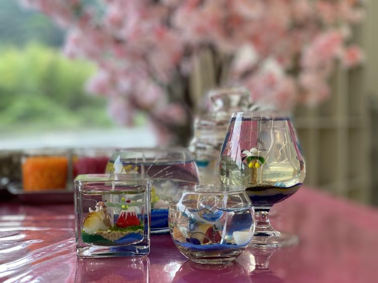数種類のグラスから容器を選び、繊細なガラスフラワーや色とりどりのプリザーブドフラワーを使用して作るハーバリウム体験です。