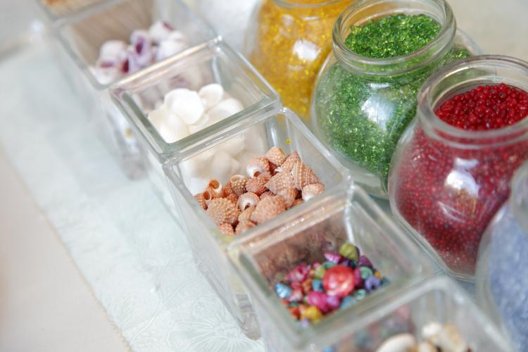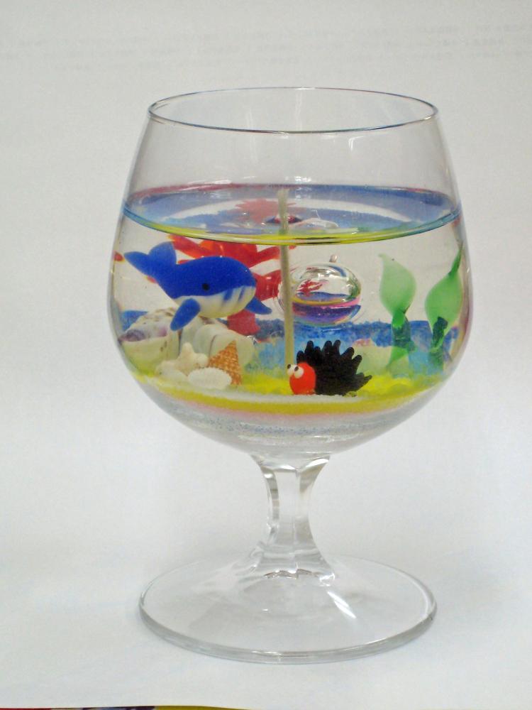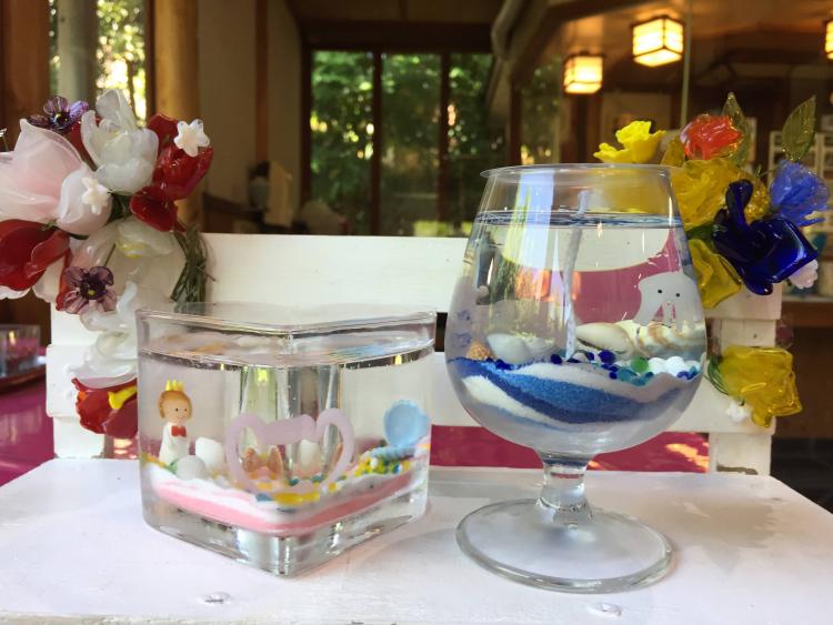 お好みのグラスを選んだら、色砂や貝殻を敷き、かわいいお花や動物達・いろいろな魚など1000点以上のミニチュアアガラスと天然フレグランスを組み合わせて世界でひとつだけのかわいいクリア・キャンドルが作れます。