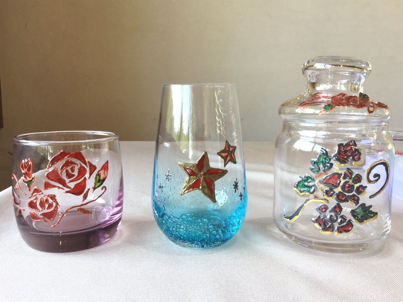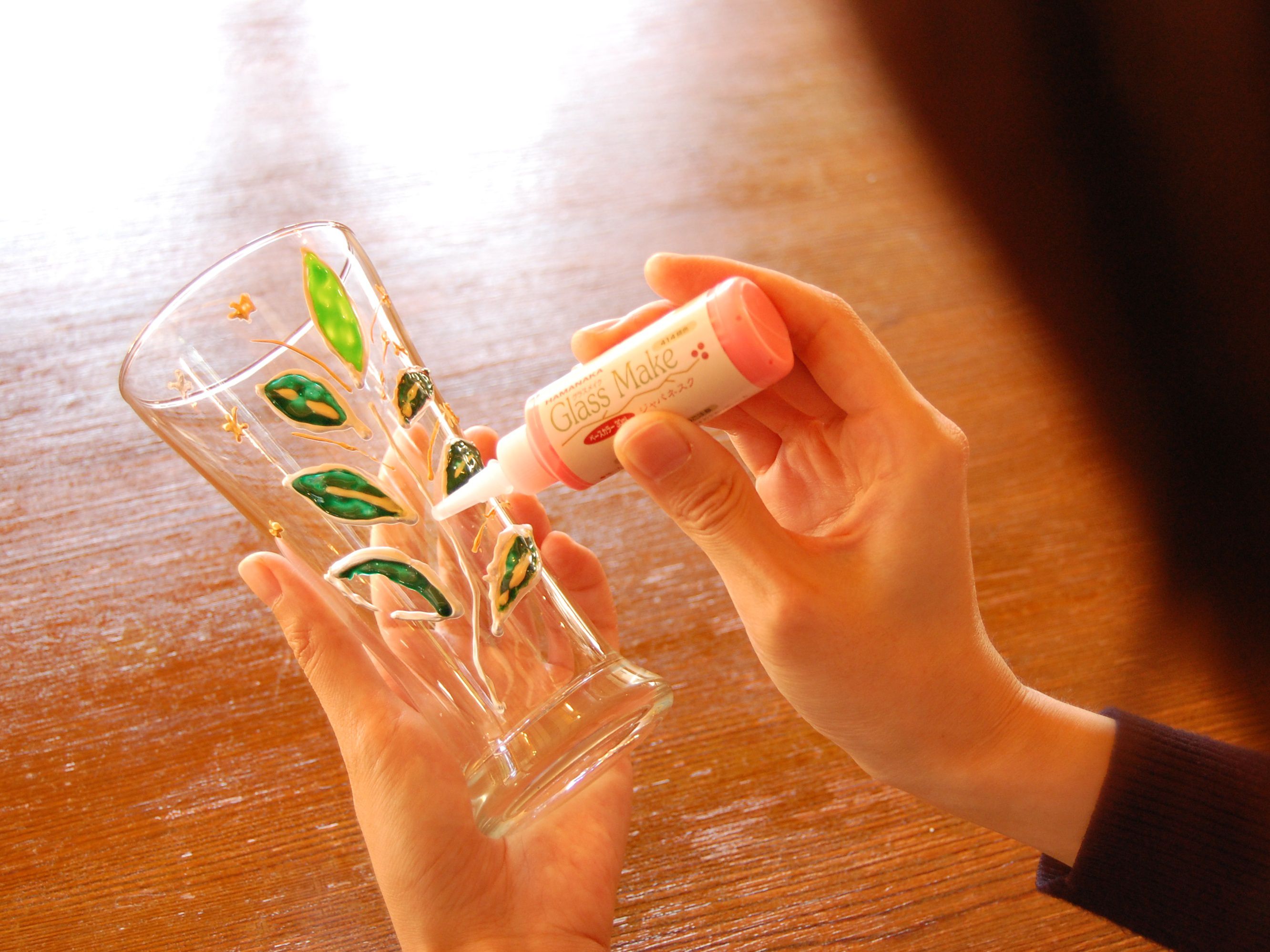 30種類以上のガラス容器や、写真たて、陶磁器類の中から、お好みのガラス食器を選び、模様に沿って色を塗ったり自由に描いたりして色と光の世界をお楽しみ下さい。