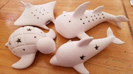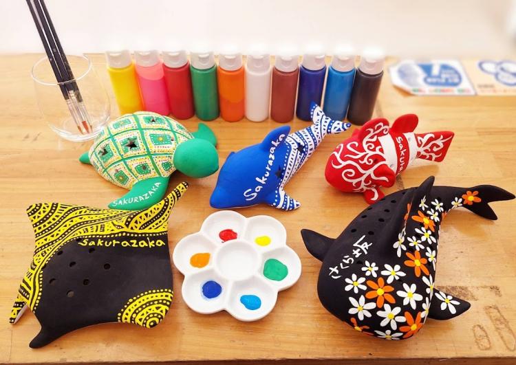 イルカやカメなどの海の生き物の素焼きの中からお好きな型を選び、自由に色付けをお楽しみください。