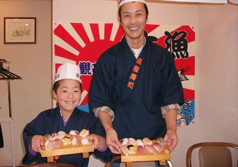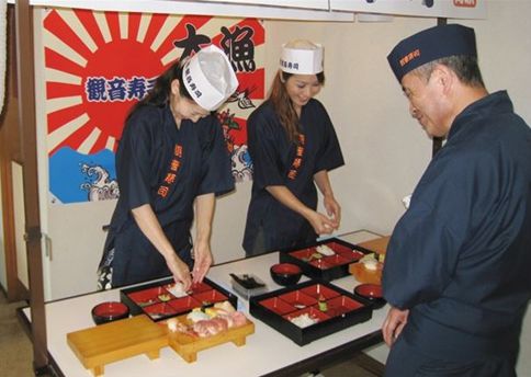 にぎり寿司体験の説明 → 伊豆天城産本わさびの擦りおろし → スタッフ指導の下、自分でお寿司を握りましょう! → 完成・試食